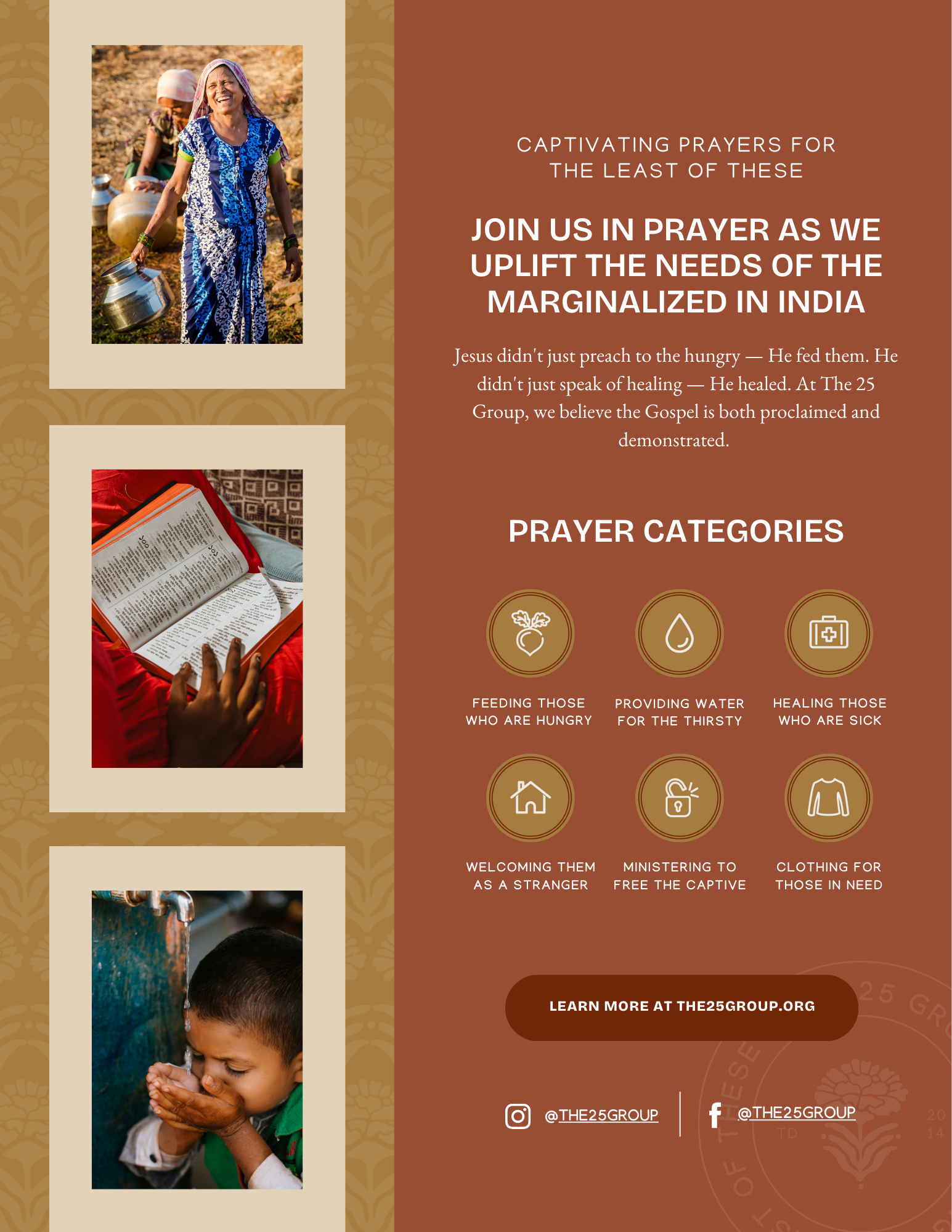 Jesus didn't just preach to the hungry — He fed them. He didn't just speak of healing — He healed. At The 25 Group, we believe the Gospel is both proclaimed and demonstrated. Your partnership sends $25 into the world's most vulnerable communities, where it becomes food, clean water, medicine, and dignity — for the least of these, and for Him.